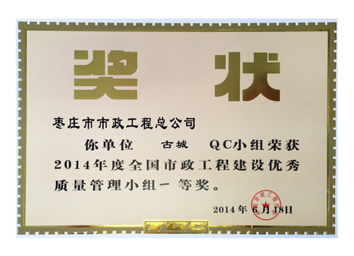 “古城”QC小組榮獲2014年度全國市政工程建設優秀質量管理小組一等獎